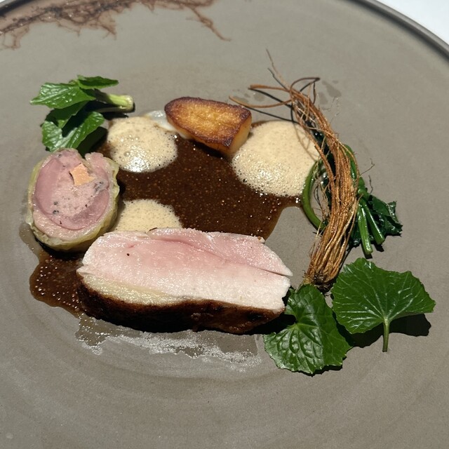 七谷鴨 胸肉のロティ 鴨もも肉のつくね 新牛蒡 雪下2年の男爵芋 白トリュフ塩 鴨出汁ソース