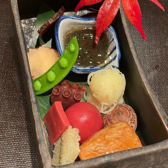 ホタルイカ、子持ち昆布、筍、ホタテ、白子、牡蠣、フルーツトマト、金柑(たまたま)など素材の味を引き出す優しい味付けや素材の食感を楽しんだり…