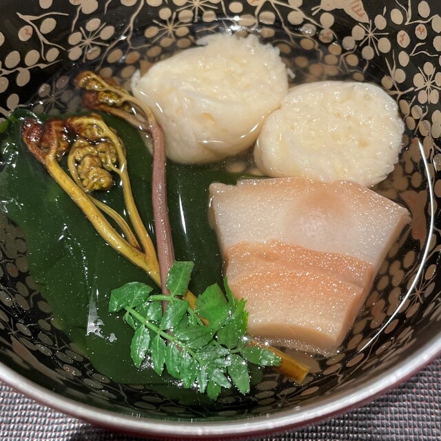 蛤の真丈 車麩 板蕨 梅肉 木の芽