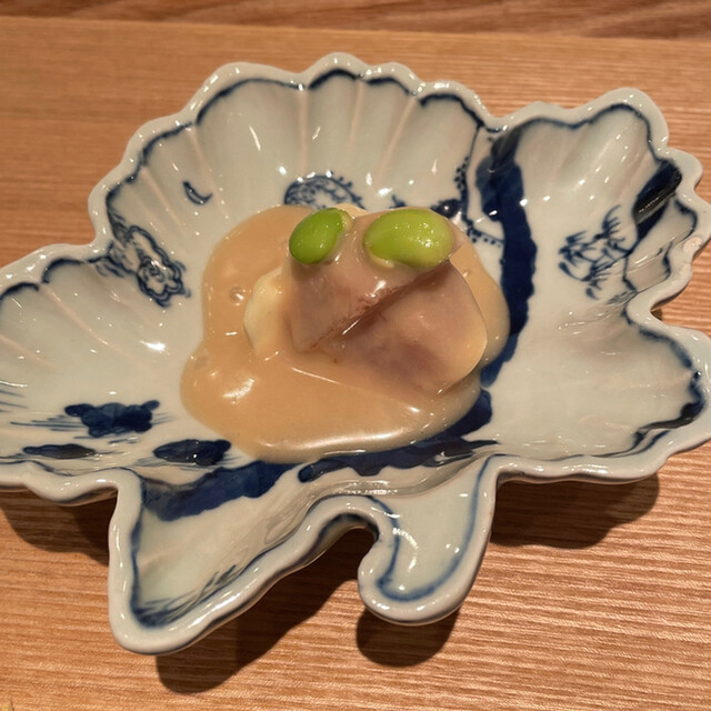 鮑、ホタルイカ、芹、うるい、子持ち昆布を豆腐のクリームで