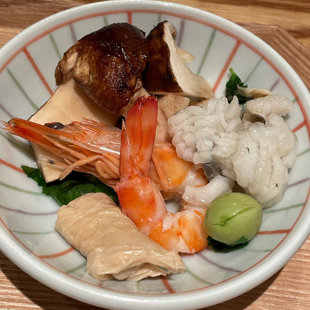 白子、牡蠣、湯葉、銀杏、椎茸、鮑、べっこう飴掛け