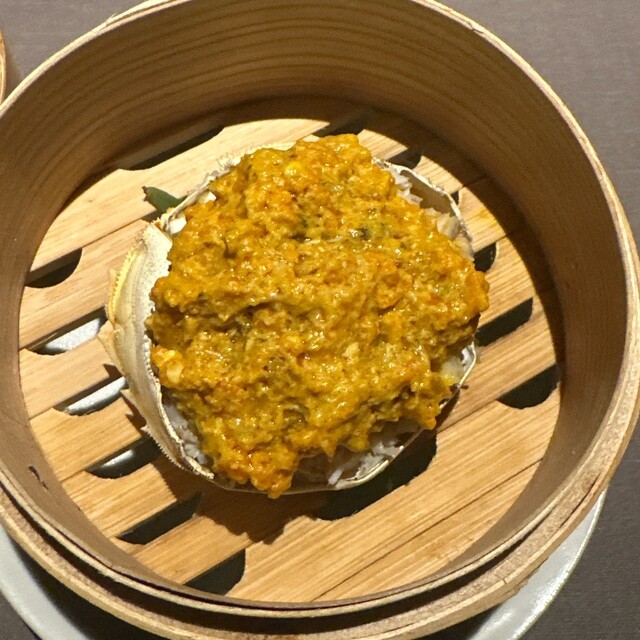 雄雌の蟹身、内子、白子を合わせた蒸し上海蟹