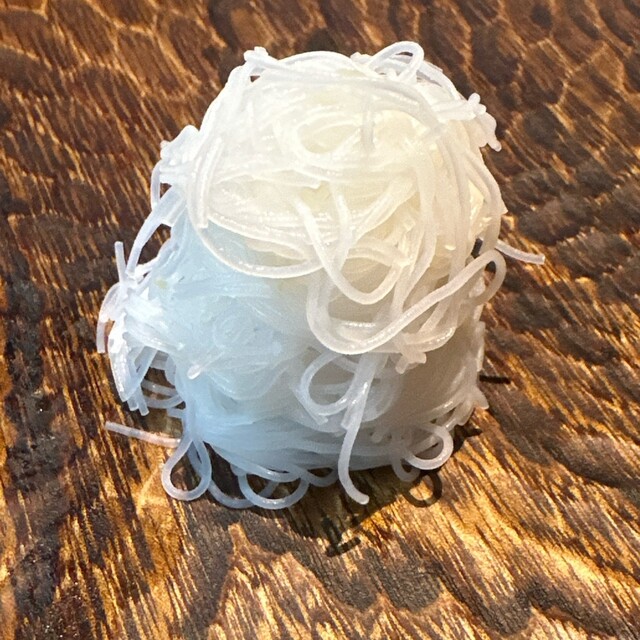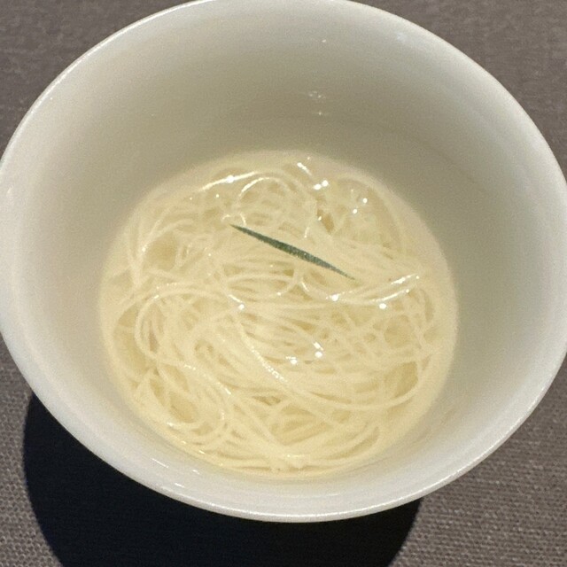 香黒文字~爽やかな香りのする楊枝などに使われる黒文字の木の冷たいお茶に極細の素麺を合わせたひと品