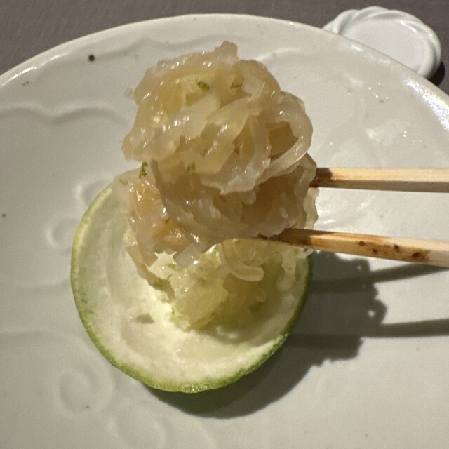 酢橘にクラゲ 蓋の酢橘を絞って