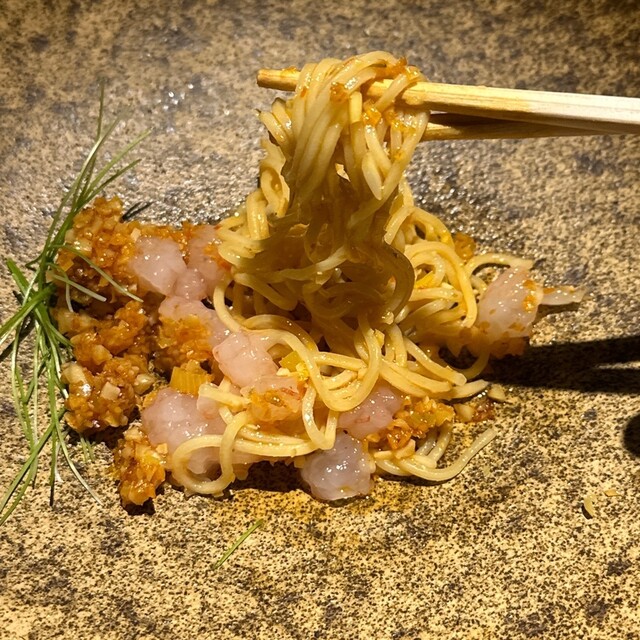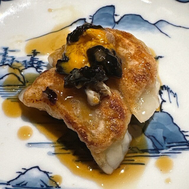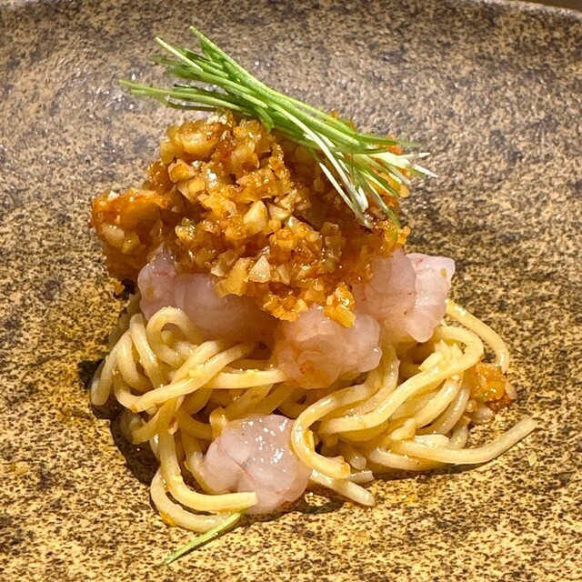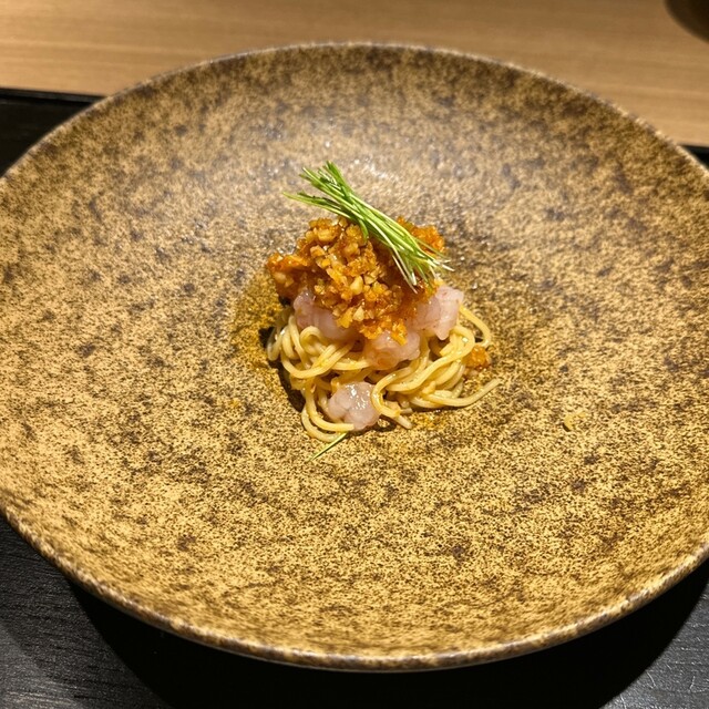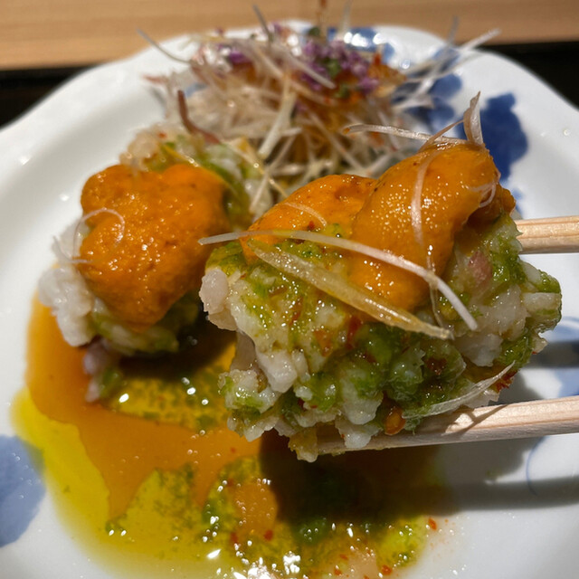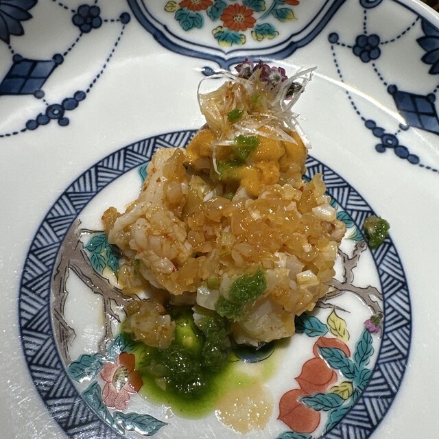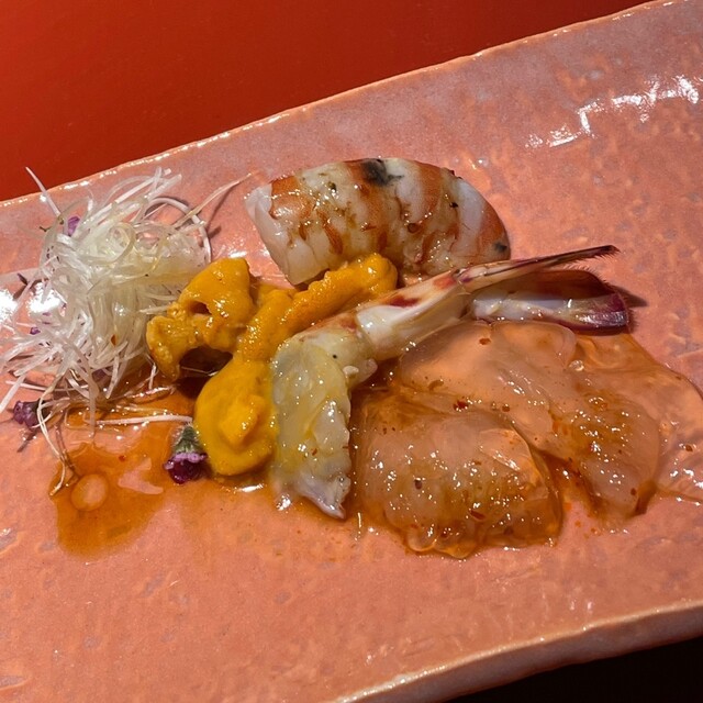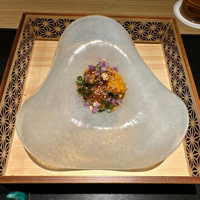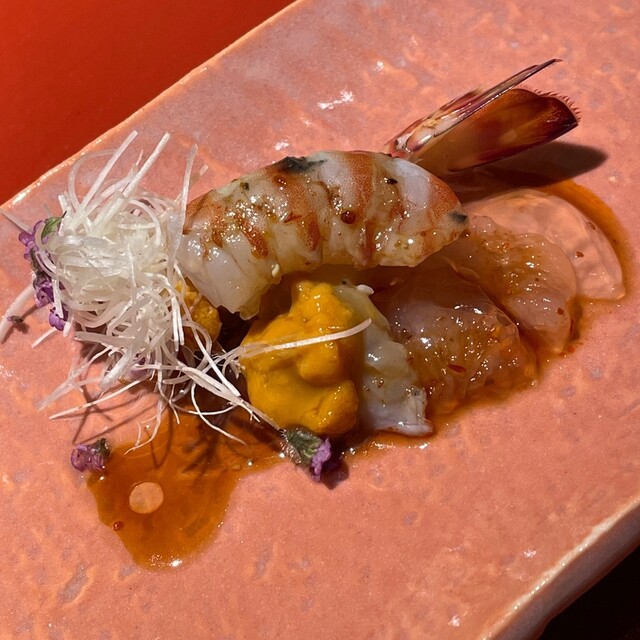 レアな車海老の下にクラゲと釧路の雲丹 中華風ソース