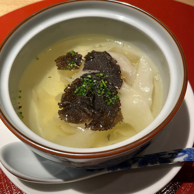 ◯上湯スープの優しい味わいにトリュフの香りが溶け込むワンタン、、