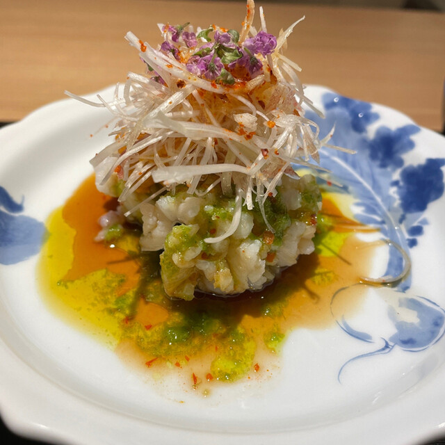 淡路島産鱧の湯引き ピリ辛の山椒ソース 雲丹 白髪ネギ ピーナツ油掛け
