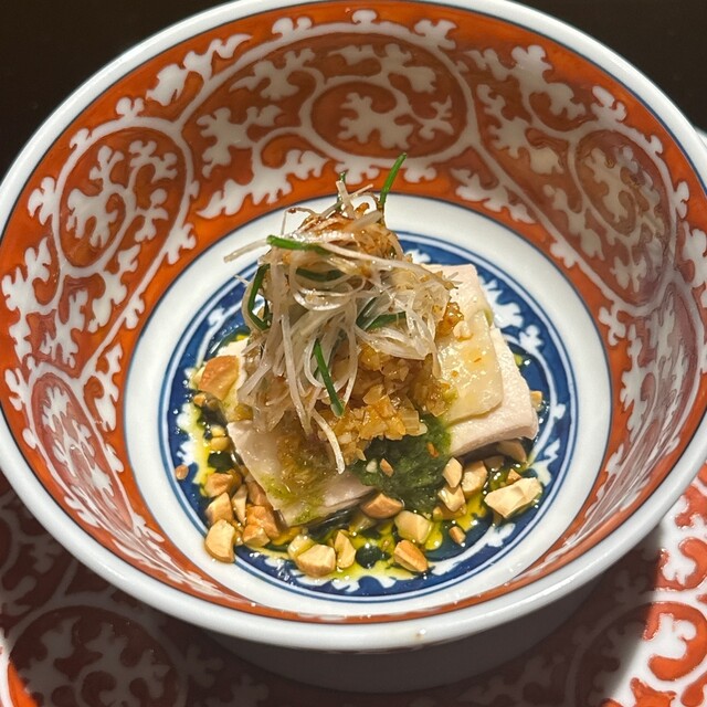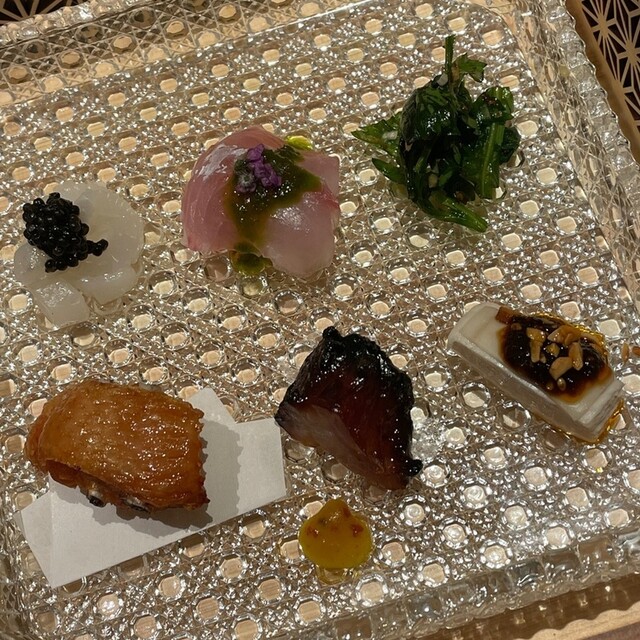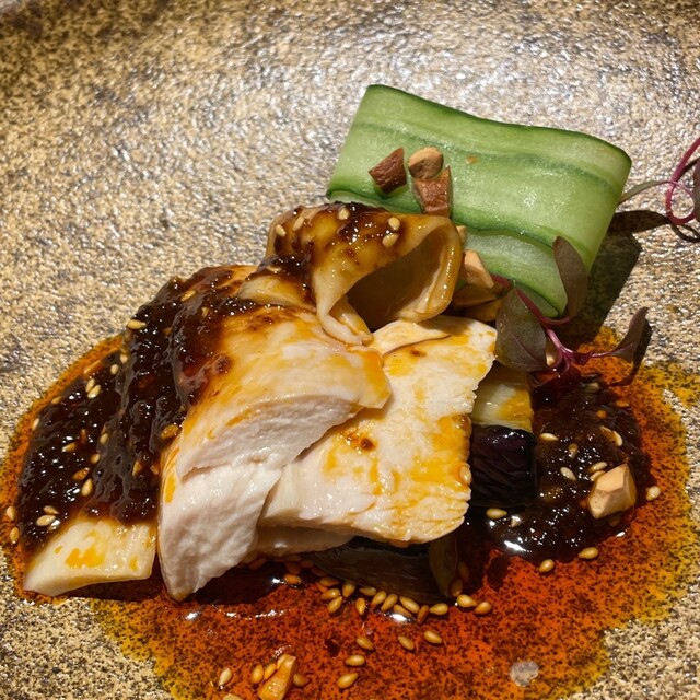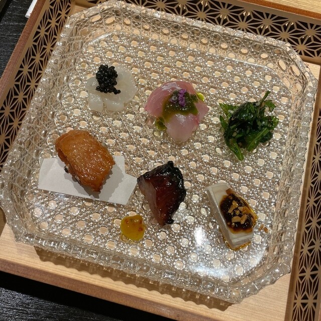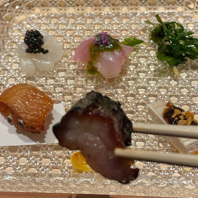春菊サラダ、山口県産甘鯛の刺身 山椒ソース、京都産アオリイカ キャビア、よだれ鶏、焼豚、手羽先の一夜干し
