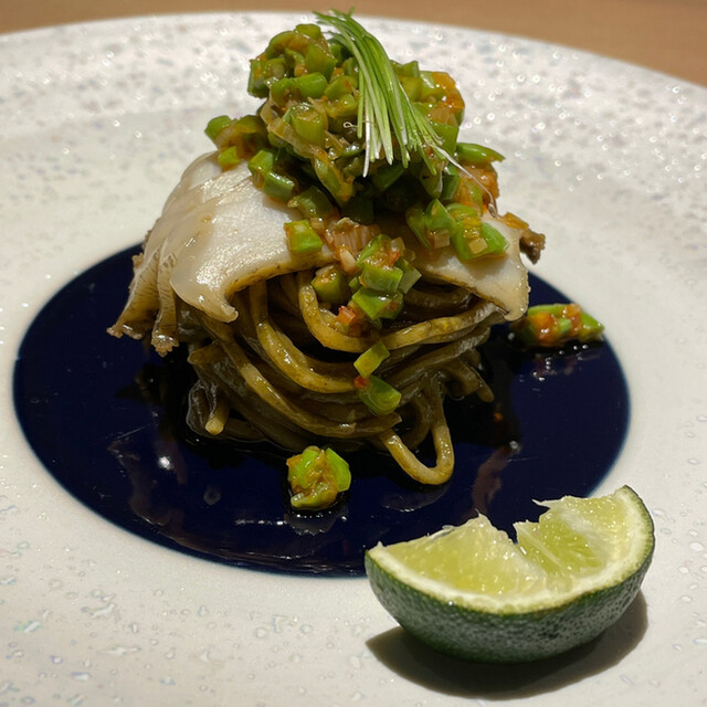 伊勢海老、虎河豚、ケンサキイカ、クエなどの魚介類に黒花牛…多種多様な食材をシンプルに美味しさを引き出す。
