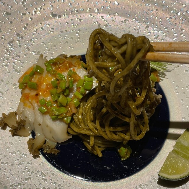 鮑の肝ソースで和えた中華麺に蒸し鮑にささげ豆、ネギを豆板醤風味で