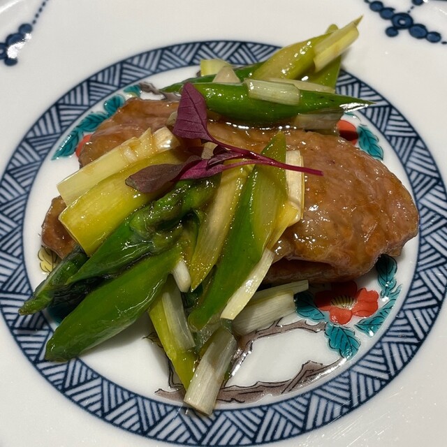 鮑 ホワイトアスパラ 黄ニラ 炒め物 大豆のソース