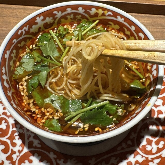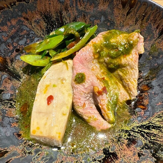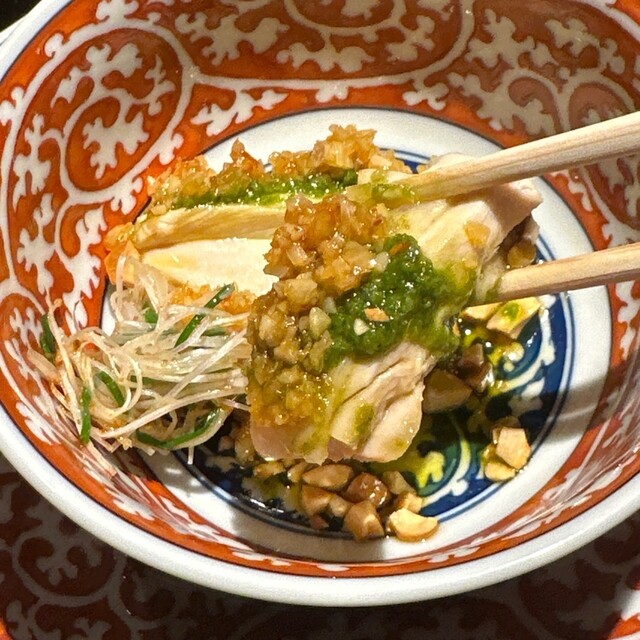 特に山椒の利いたピリ辛の椒麻(ジョーマ)ソースや千切りにした白髪ネギと生姜に熱々のピーナッツオイルを掛け、ジュッと云う音と共にネギと生姜の香りが立ちあがる。