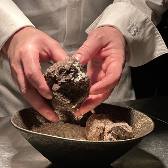 漆黒~北海道産馬糞ウニ、海老、鶏モモ肉、秋田いぶりがっこを竹炭を練り込んだもち米で包んだひと品