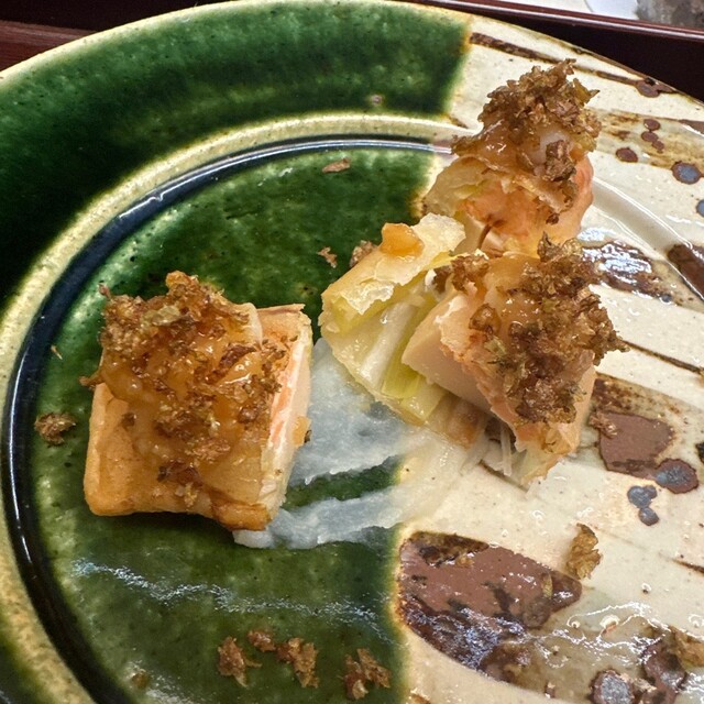 余市あん肝、能登岩もずく酢、柿の白和え、三つ葉、せんだい麩、菊菜のお浸し、愛知鴨の治部煮、真魚鰹おかき粉フライタルタル、シルクスイートの焼き芋