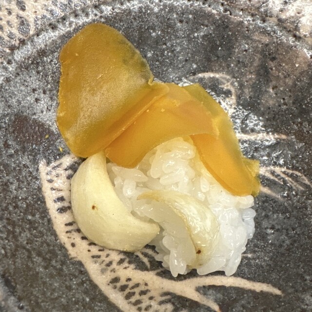 八寸 テーマは夜桜〜白魚のたまじめ 富山のホタルイカ 海鼠入りもずくす 鯛の子の旨煮 北寄貝とこのわた 粟生の照り焼き そら豆のおかき粉揚げ シルクスイート