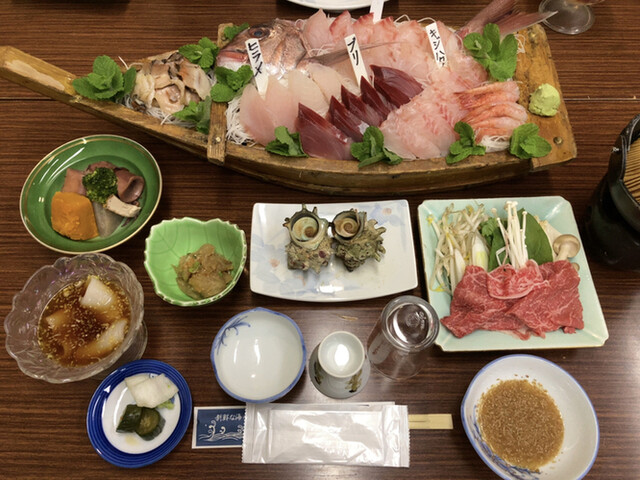 さざえのつぼ焼きや天ぷら、煮物に加え、佐渡牛のしゃぶしゃぶまでついて言うことなし。