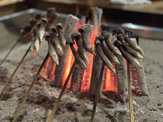 長良川の子持ち鮎が大将と共にお出迎えです。身は薄いですが卵がパンパンで最高の味わいでした。鮎はしばらく会えません。お供はランソンブラックラベル。