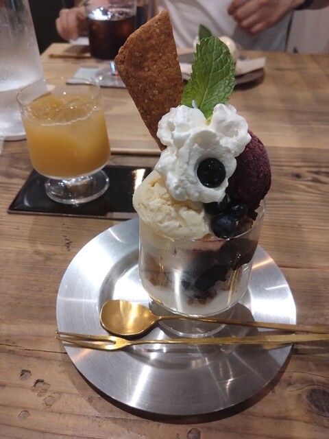 パフェもブルーベリーのシャーベットに塩アイス、クランチが他の店だとコンフレークだから、クランチが特に美味しい、シフォンケーキも入ってるし(๑><๑)۶ プリンも美味しく、すごく美味しいパフェだった。