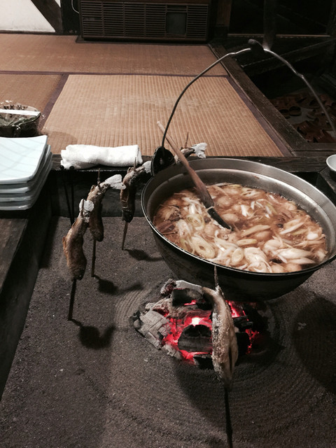 さて、お食事は専用の建物があり、そこには囲炉裏端で夕食と朝食を摂ることができます。