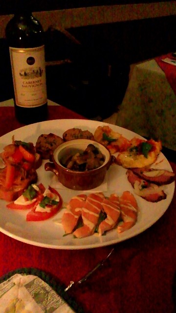 鴨のリエット、チーズのカナッペ(ドライフルーツ入りのパンが美味!)。