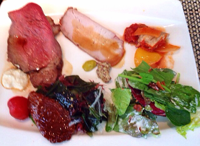 一皿目は数種の生ハムやチーズ、サラダに白身魚、焼売など。別皿にビーフ・ストロガノフとタイカレーも。