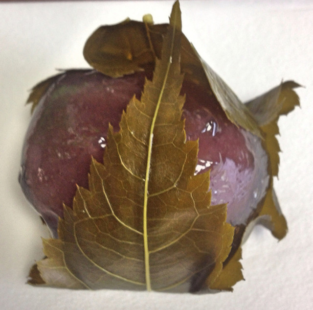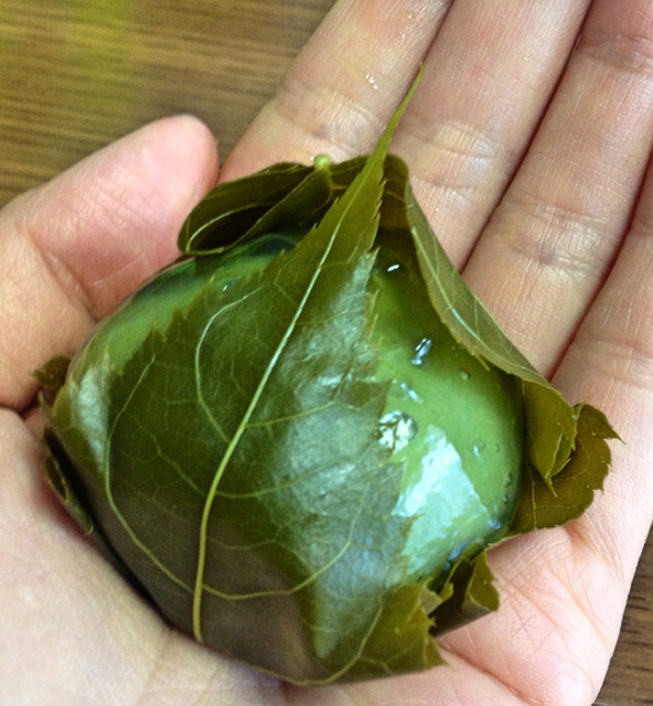 初めに桜の葉の塩漬け、次に透明な葛のぷるぷるとした皮、最後に抹茶餡の順番で舌の上に乗って来て、