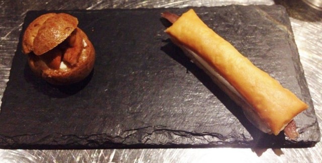 ・前菜一皿目、うにとクリームチーズシュー&アンチョビミルフィーユ