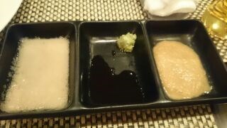 玉ねぎ、わさび醤油、ごま の3種のソースでいただきます。