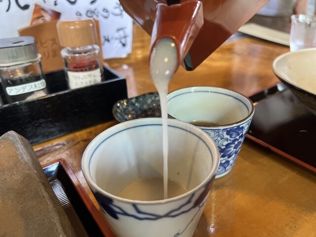 蕎麦湯は別の椀で、茹で汁とは別に作るポタージュの様な粘度。風味も含めて旨し。