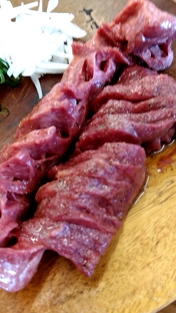 まほろばの名物メニューです。長くて大きな肉の塊を広げてコンロで焼きますが、迫力ありますます。一口大の大きさにハサミで切って食べます。新鮮で柔らかいです。レモン絞って食べるとあっさりして食べやすい肉です。