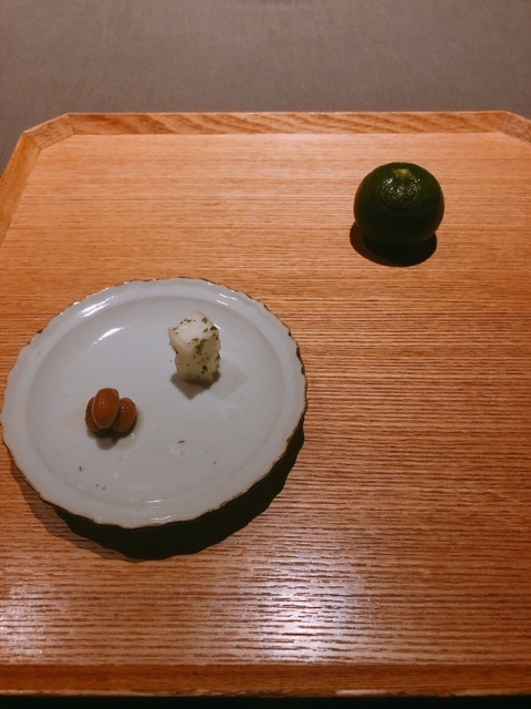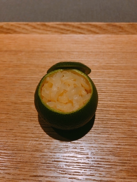 続いて、酢橘窯に入った海月と山椒で漬けた独活。