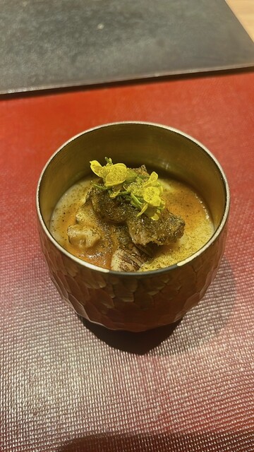 海老の出汁、ボウナ(山菜)のっけ。ゴルゴンゾーラの風味がまとめ上げる。
