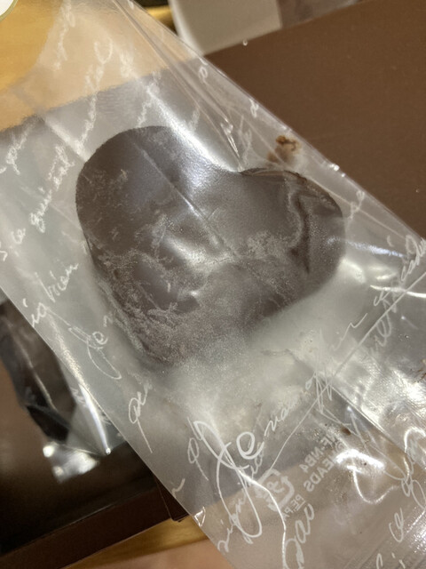 ふろしきまんじゅうをチョコでハート型にコーティングされています。