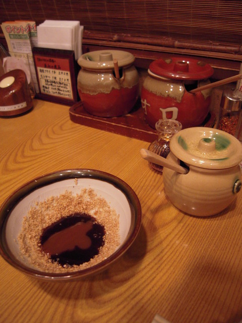 「たれ」は、「甘口」「辛口」が卓上の陶器の入れ物に常備され ブレンドして楽しめる