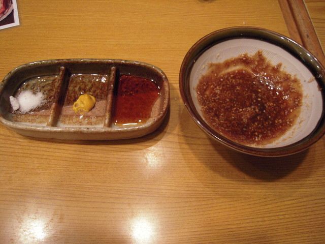 「塩」の他に、「三色皿」なる小さい皿の真ん中に「辛子」が落されており、「出汁醤油」と混ぜてさっぱり味わうのもよし