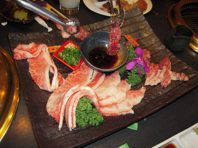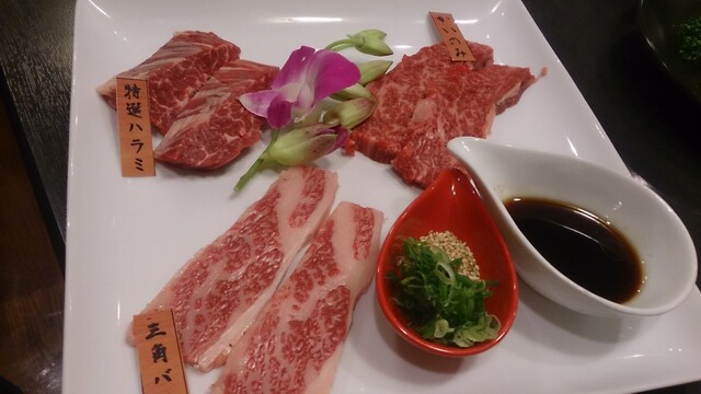 特上バラ&特上ハラミ(上) 濃い味の付けダレに浸してから焼きます