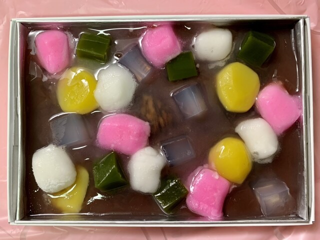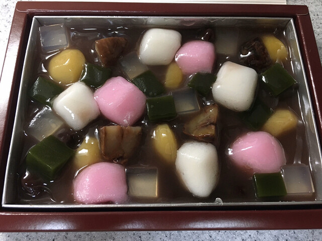 冷たくてぷるんとした食感が心地よい!厚さ1㎝ほどの柔らかな羊羹の中には、主役でもある紅白餅のほか寒天や抹茶のジュレ、栗が散りばめられている。全体的に甘さは控えめで柔らかなお餅との相性も良い。見た目も涼しげでカラフル。「宝石箱や〜‼︎」と誰かが叫んだかどうかは知らないが(^^)