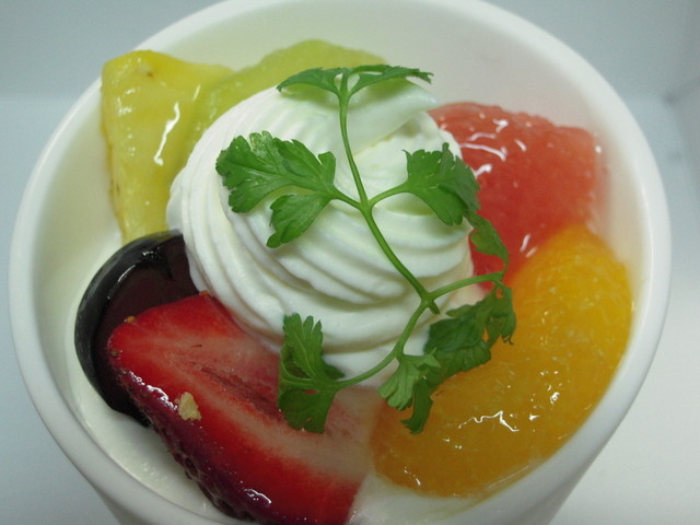 その上には紅白の白玉のような団子に桜桃、栗、杏子、パイン、その中心に餡子がトッピング。