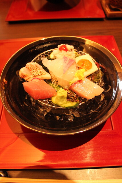 お造り 鳴門鯛二種、雲丹、鮪、鱧の落とし、かんぱちを少し甘めの土佐醤油で