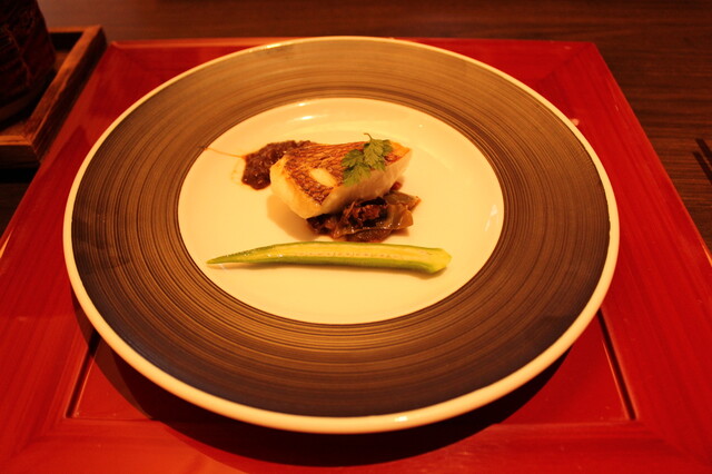 旬魚のポワレ 夏野菜のラタテゥイユそえ魚介風トマトと黒オリーブのソース