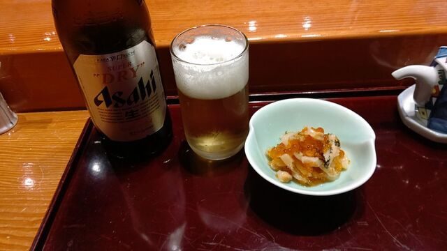 ●ランチ・単品。付出 特製松前漬+料理15,072(造盛り+北寄貝ヒモ串焼+メバチ鮪マグロはがし漬の茶漬)+中瓶B 682X2+冷酒 (一ノ蔵限定 1合 1,210X2)=18,854円
