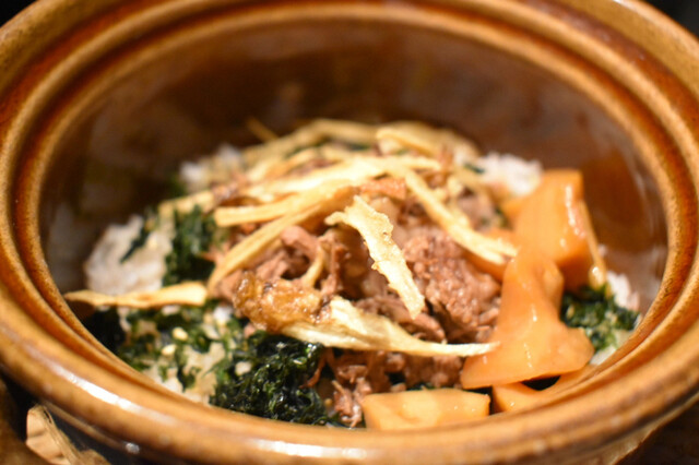 季節の混ぜご飯 (牛しぐれ煮と蓮根) 香物 赤出汁