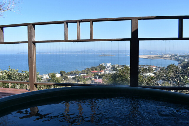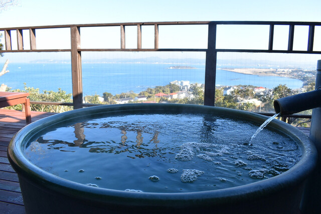 風呂のお湯と海と空が一体となる、今流行りのインフィニティデザイン。