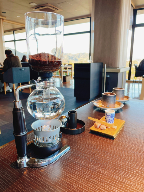 グリーンスムージー、グレープフルーツジュースで整え、最後はサイフォンのコーヒー。