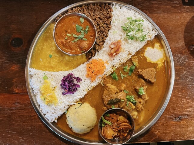3種のカリーとフェンネルキーマ、チャトニ、副菜を少しずつ、組み合わせの妙を楽しみながら混ぜていただく。