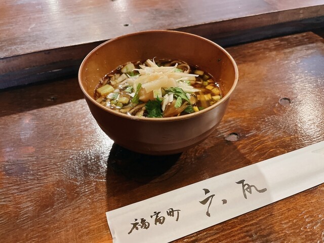 まず運ばれたのは、ショウガとミョウガのスパイス蕎麦。
