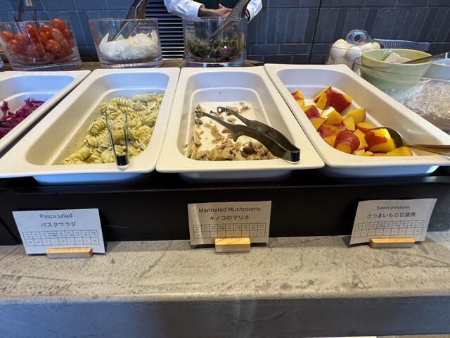 レタス、しらすとブロッコリーのマリネ、自家製ハム、じゃがいもサラダ、小松菜とお豆の和風マリネ、キャロットラペ、赤キャベツマリネ、パスタサラダ、キノコのマリネ、さつまいもの甘露煮…。