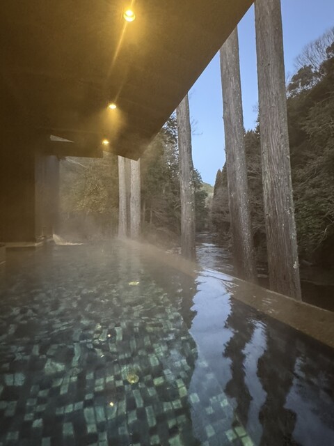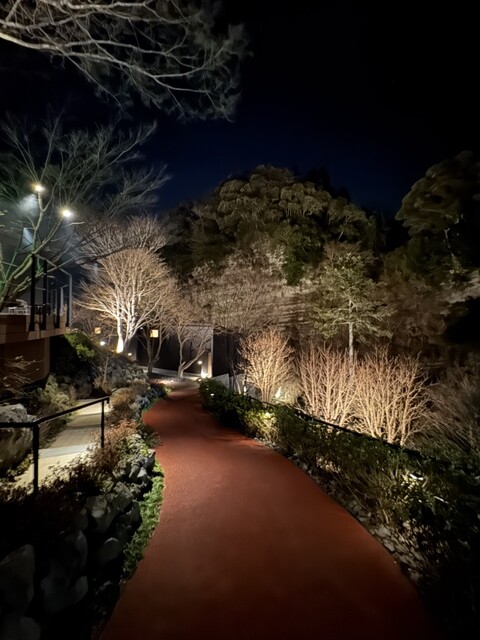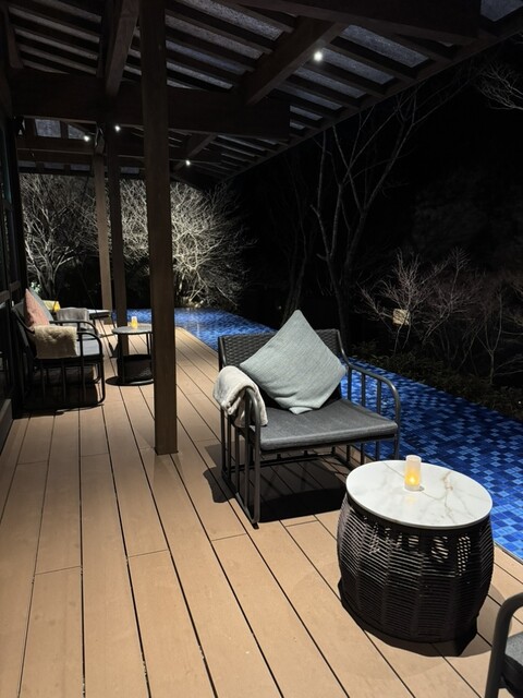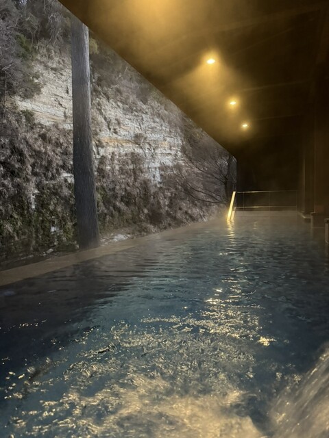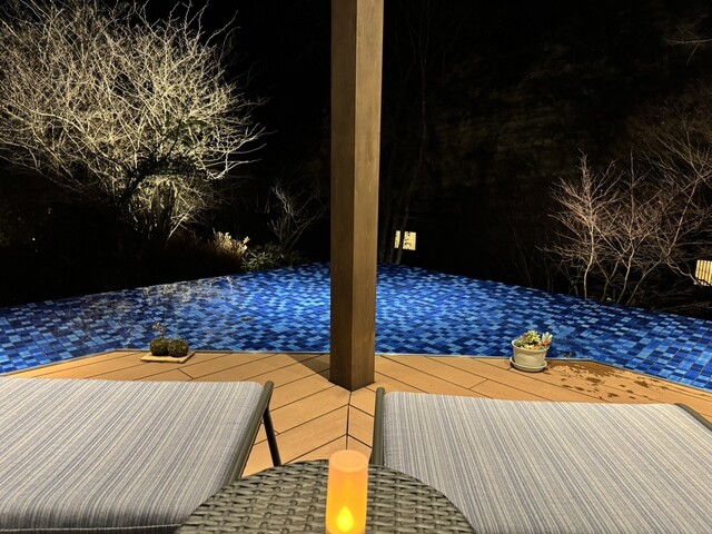 酔いを楽しむかのように、夜風に当たりながら部屋まで歩き、そのまま大きな露天風呂に飛び込み、何も考えずに懸崖境の暗闇を眺める。