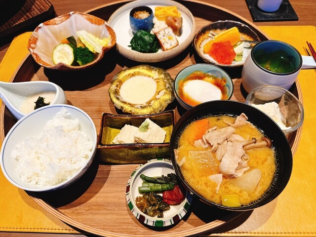 ダイニング「FUKUSUI」 での朝食は、「炭火で焼き上げた厳選した干物」、「炊きたての釜炊きご飯」、そして「地元食材を使った彩り豊かな旬菜」など、日本料理の基本を丁寧におさえた料理。