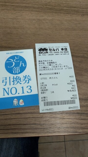 注文書に肉うどん大と書いて渡すと番号札を渡され番号で呼びますのでお待ちくださいと言われますが 出来上がると先ほどのジャージの女子高生がテーブルまで運んで来てくれました。